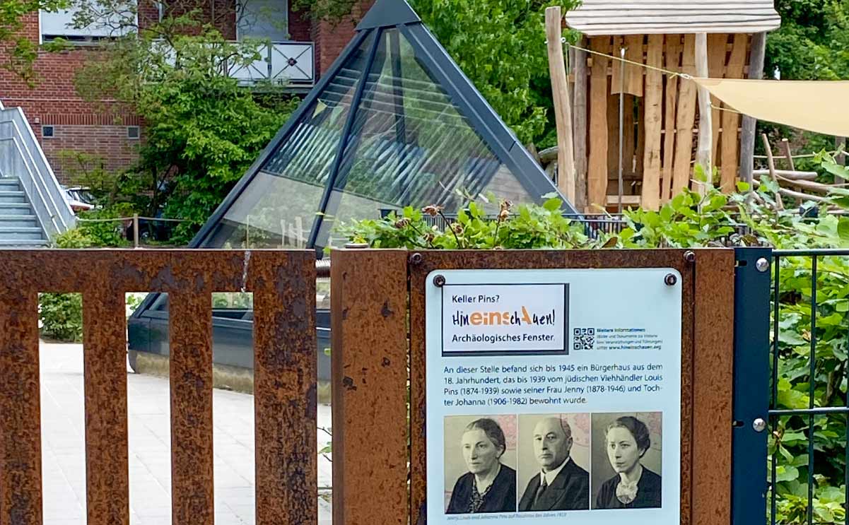 Durch eine Glaskonstruktion auf dem Platz geht der Blick der Besucher hinab in den ehemaligen Keller der Familie. Zu sehen sind ein kleines Regal, ein Gurkenfass und eine Kartoffelkiste sowie ein Teil des Gemäuers und der ehemaligen Außentreppe. In dem Haus, das einmal über diesem Keller stand und das 1945 bei einem Bombenangriff zerstört wurde, lebte der jüdische Viehhändler Louis Pins mit seiner Frau Jenny und der Tochter Johanna. Er war Vorsteher der jüdischen Gemeinde.
